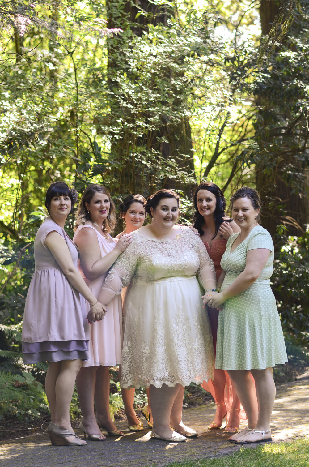 Their ceremony was outside of the lodge, officiated by a friend, who read parts of a Wonder Woman comic book. Their bridesmaids and flower girls all wore pastel dresses in different colors and walked down the aisle holding books (rather than bouquets) to the Golden Girls’ theme song, “Thank You for Being a Friend.”